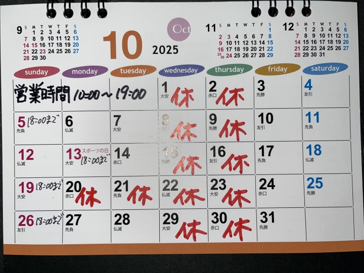 2017.09.29 | 10月のお休みのお知らせ。10/5(木)10/12(木)10/18(水)10/19(木)10/22(日)10/26(木)です。18日と22日は諸事情によりお休みさせていただきます。 |